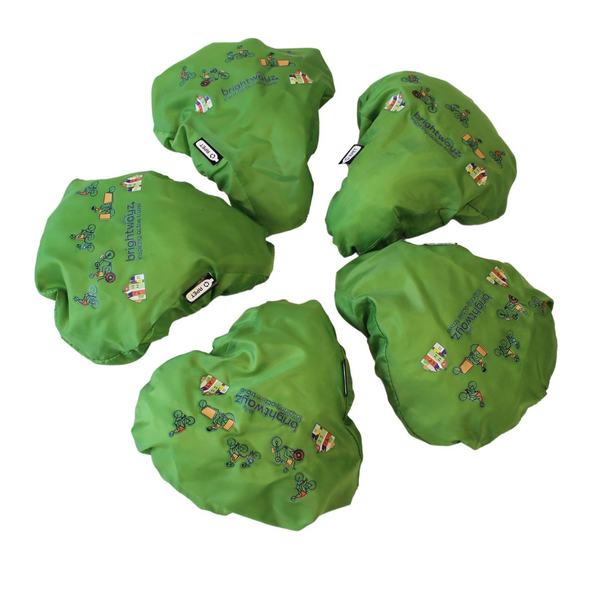 Whether you are organising a cycle event and need a practical giveaway, promoting cycling at your school or workplace or you just want to keep your own bike saddle dry here’s the perfect answer. These are eco too as they are made from rPET (recycled plastic). Low cost, bright, fun and can help protect your saddle from the elements when you’re not around.