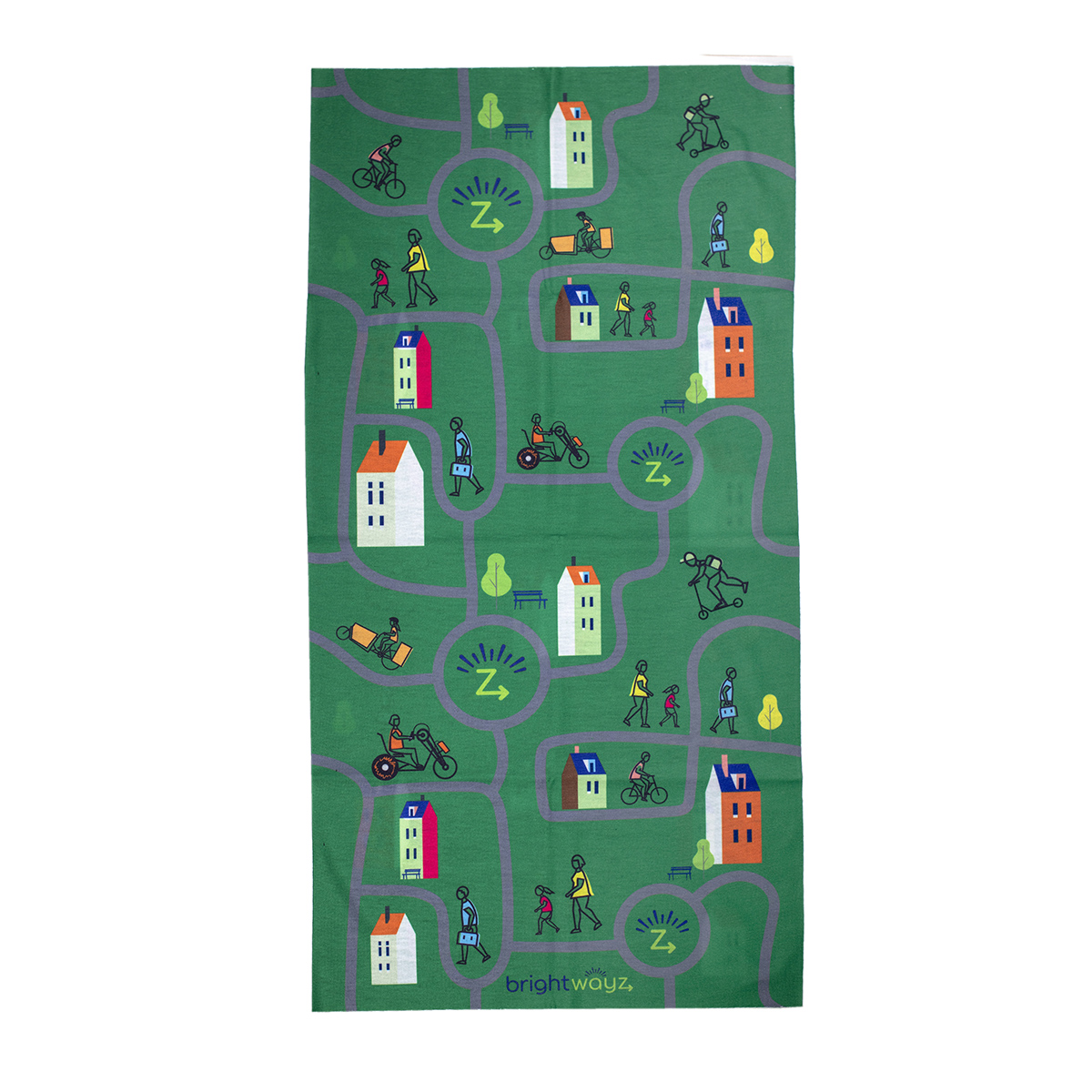 Introducing the Brightwayz active travel neckwarmer with an engaging design featuring different modes of active travel – scooting, walking, cycling, cargo biking and even hand-cycling.