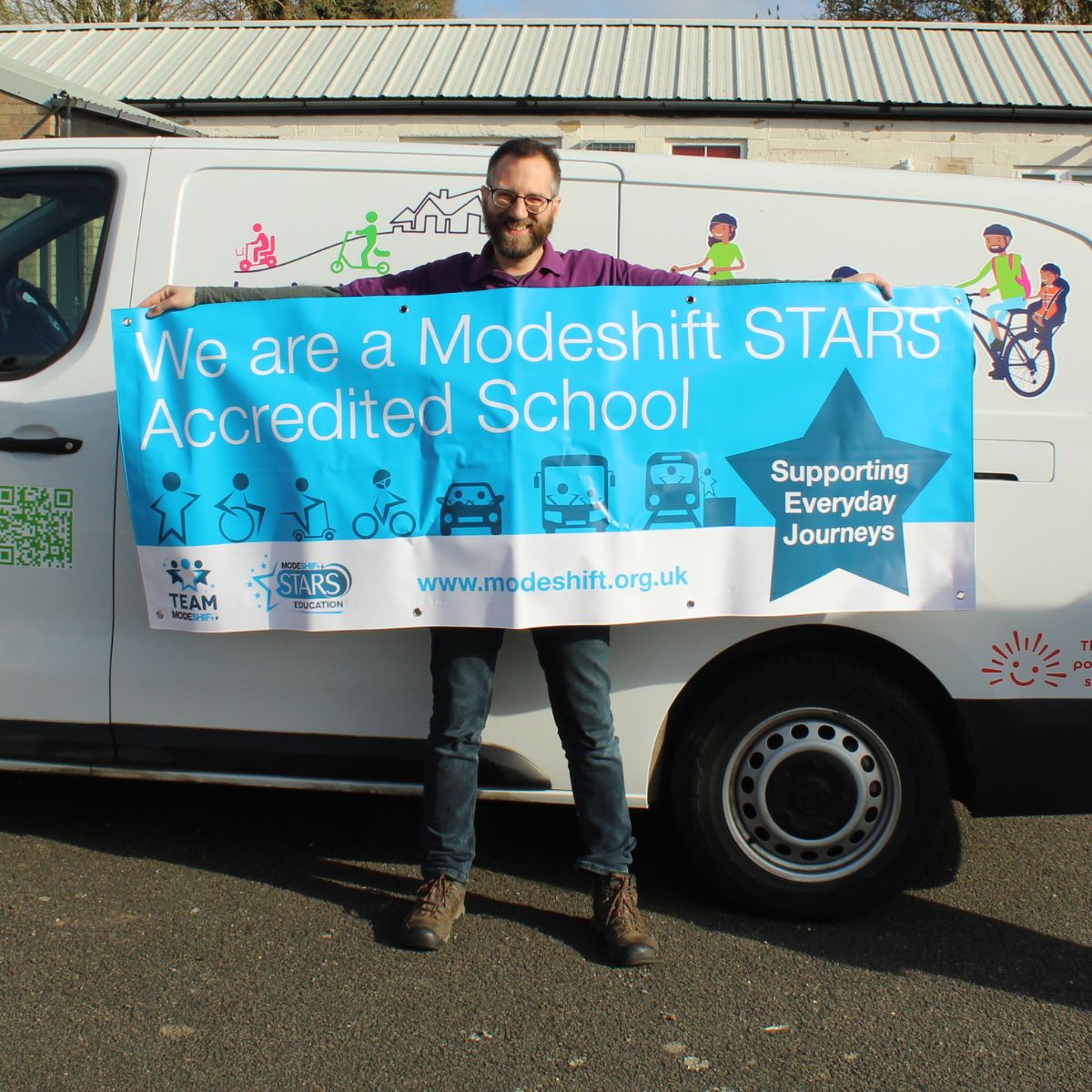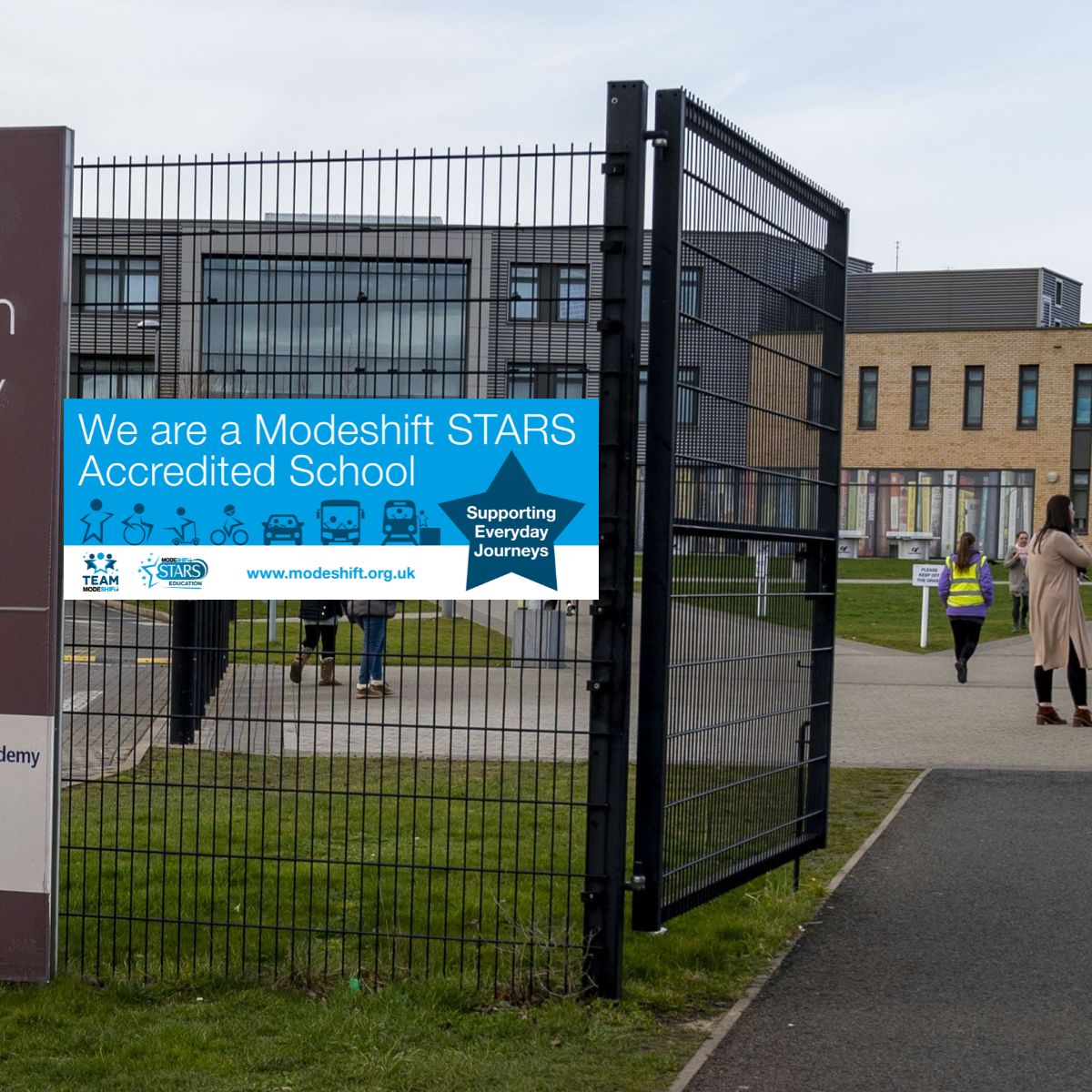 A bold and bright banner message on the school gates informing parents and passers-by that you are a Modeshift Accredited School.
