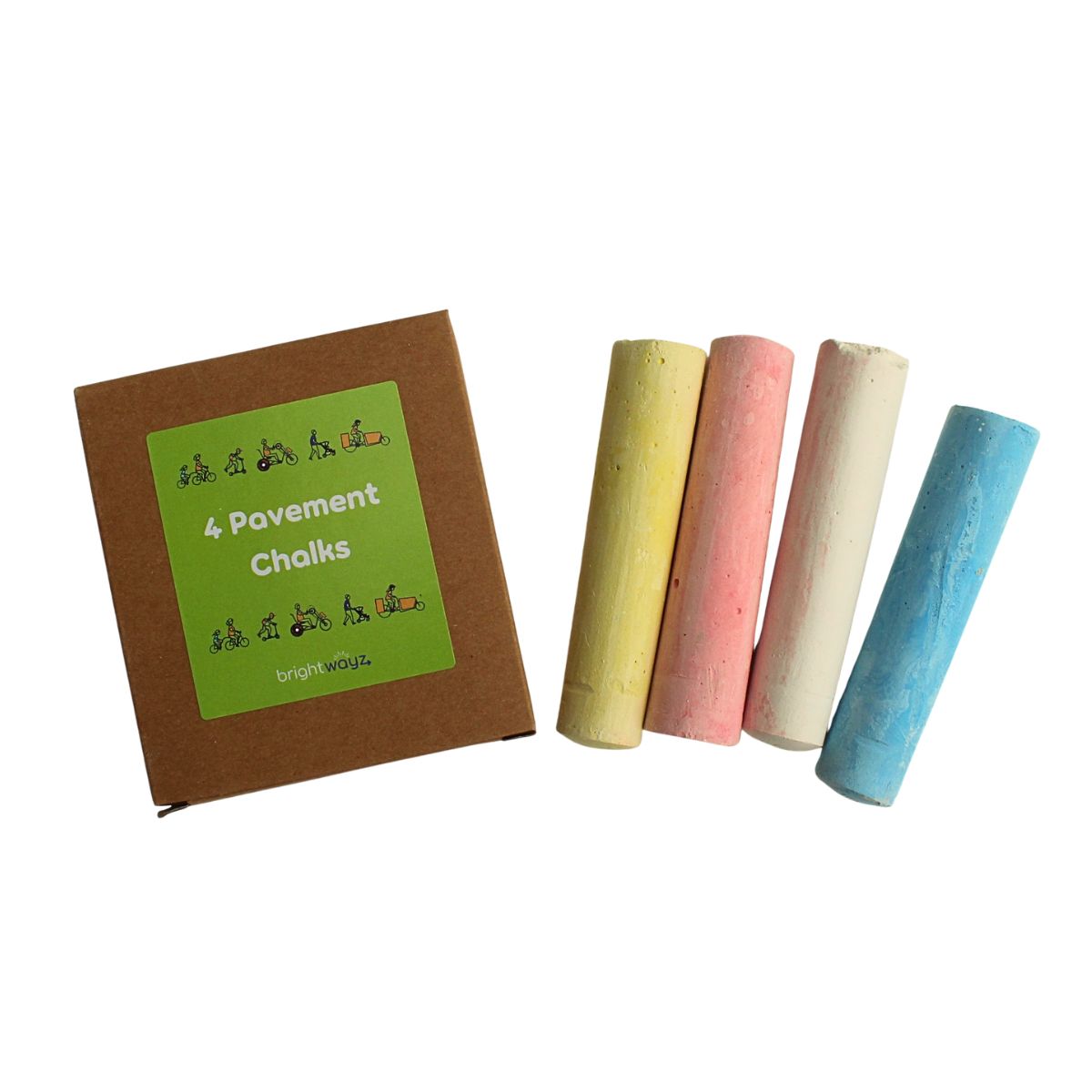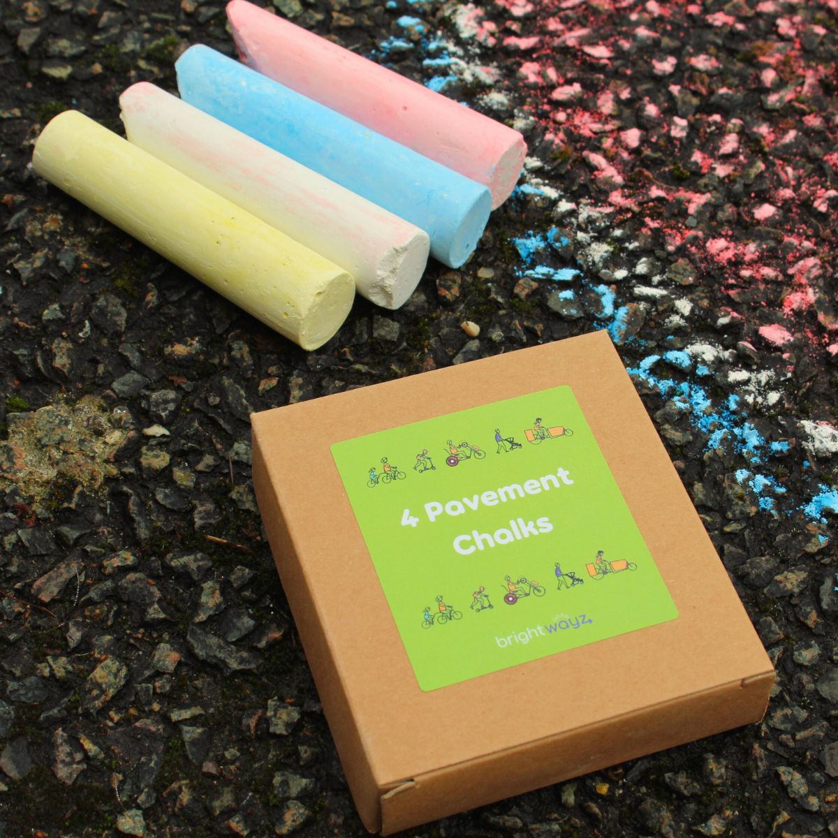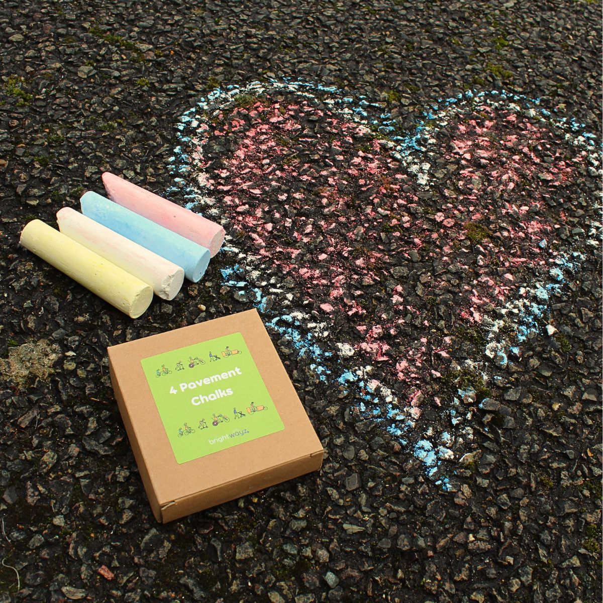 Large pavement chalk pack with Brightwayz sticker. Bring games to the tarmac by marking out the road for hop scotch, noughts and crosses or even an obstacle course, the possibilites for play are endless.